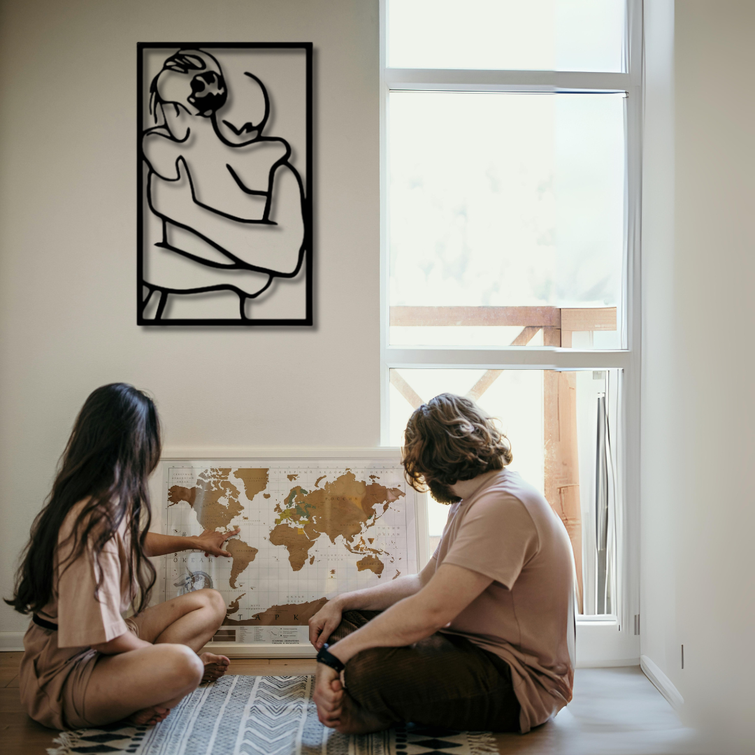 لوحة فنية معدنية على الحائط تصور زوجين يحتضنان بعضهما
